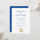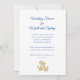 Nautical wedding or bridal shower invitation. White cards with navy blue text and two gold anchors to represent the couple. Script font at the top is larger for type of event and who it's for. All other text is added in a paragraph to include as many lines as are needed.