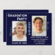 This invitation features 2 photos for two graduates. Joint graduation parties are becoming a common thing and this invite allows easy setup for a double party. The main colour scheme is white and blue and the overall design is held rather simple and straight forward.
