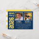 Announce your two class of 2022 high school graduates in style with this graduation announcement and party invitation. Two-sided card is designed for two grads and features their photos with a simple and masculine design with sports jersey inspired lettering. Navy blue, yellow, and white colors can be customized to match your school colors. A pattern of white stripes dresses up the back of the card.