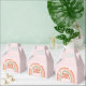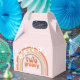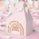 Retro inspired two groovy second birthday party favour box with hippie style rainbow, daisies and boho fonts and colours.