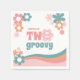 Personalised Two Groovy Girl Birthday Party Napkins. Capture the vibe of a retro, groovy theme with this Daisy Paper Napkins. Perfect addition to your daughter´s 2nd birthday party. The original retro playful font and rainbow-like colour scheme will transport guests back to the free-spirited, flower-power times. Beautifully adorned with daisies, these plates will make any party decoration shine. Personalise with your girl's name.