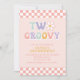 Two Groovy Retro inspired 2nd birthday invitation with 70's style fonts and daisies and chequered pattern.