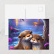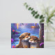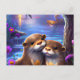 Two Happy Baby Otters Hugging in Glowing Blue Wate Postcard