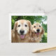 This postcard features a photograph of two happy, smiling golden retriever dogs outside, surrounded by green trees. Text is fully customisable.