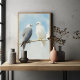 A detailed painting of two hawks perched on a thin branch with a soft, clear blue sky in the background. One hawk is grey with dark accents, while the other is bright white with golden talons, creating a striking contrast. The textured brushstrokes give the artwork a gentle and natural feel, perfect for capturing the beauty of birds in their natural habitat.