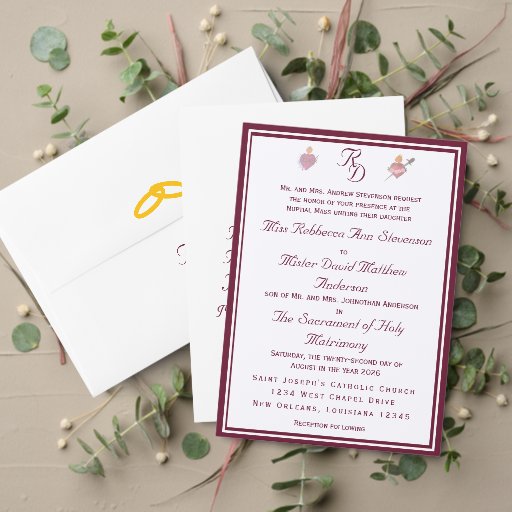 Two Hearts Burgundy Catholic Wedding Invitation