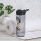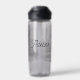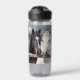 A personalized water bottle with an illustration of two horses on a snowy winter ranch with a full moon in back of them standing behind an old rustic fence.