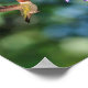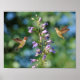 Two beautiful hummingbirds in flight captured with purple flowers poster wall art.