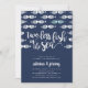 Our coastal chic summer engagement party invitations feature a school of fish in white, with a kissing pair of fish in contrasting aqua. "Two less fish in the sea" appears in brush calligraphy lettering, with your engagement party details beneath, in white on a nautical navy blue background.
