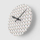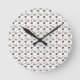Two images of a round wall clock with black hands. The white face is patterned with small icons, including hearts and coffee cups. The first image shows a front view, the second an angled view.
