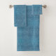 Alt text: "Two images of blue towels with a geometric diamond pattern. The top image shows a towel set on a rack, and the bottom image shows a washcloth with a folded corner."