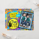 Twin Hip Hop Birthday Invite with black and white chequerboard pattern behind bright colourful paint splatter including Photo Frame