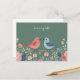 Two adorable little birds, one pink and one blue, perch among pink and cream flowers, on this very cute postcard to say hello to someone.