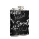 The flask itself is fine. It’s a cheap flask, obviously bought in bulk, however am prepared to overlook that. Given that it is a personalized item, I would have liked to have seen gift boxing instead of the generic packaging. Terrible printing, and/or quality. It’s a cheap, tacky vinyl. It is not cut straight and is also applied in a way that it is overhanging the bottom, causing the glue to catch on items and it will eventually roll and tear, damaging the wrap.