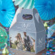Wedding favour box design with two photos of newlyweds, blue-grey background colour with customisable white botanical flowers embellishments monogram—personalizable names and date.