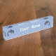 This acrylic desk name plate is light blue with a ocean blue dolphin with a white stomach in a jumping position at each end. Customise your name with the template.
