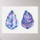 Two oyster shells with pearl print by the watercolor artist Cheng Jing. The colour scheme is purple and blue.