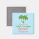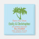 This design features two green palm trees against a blue background with the wedding details written in orange and green. Perfect for a beach themed wedding.