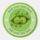 Snuggled together inside a green pod are two adorable peas. Each pea has dots for eyes and a happy cheeky smile. Surrounding the pod are vines and green leaves. The design is set inside a green circle. Around the edge, top and bottom are templates to add your own text. The background is green with tiny polka dots.