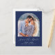 This simple, minimalist boho Save the Date postcard features an arch-shaped photo above the words "Save the Date" in elegant white handwriting script, followed by the couple's names, wedding date and city in sans serif font on a navy blue background. Add a second, rectangular horizontal photo on the back, along with your return address and additional text with more information or details.