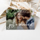 This whimsical and modern elopement or marriage announcement postcard features two of your favourite wedding photos, with trendy white rustic handwritten script and a small, stylish heart and says "just married." The back contains a second photo with a translucent overlay, and more of your wedding details and information. A simple and trendy look that is the perfect way to let family and friends know you tied the knot!