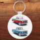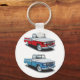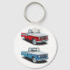 A couple of pickup trucks together. One red and one blue. This design looks really effective on this Keychain