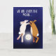 This card depicts two rabbits, one white and one ginger, jumping holding paws, jumping in the night sky with a white winking moon in between them."We are over the moon" is written at the top.