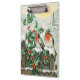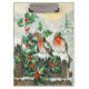 Vintage Christmas illustration of two little robins sitting on a fence with holly berries in the snow.