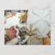 Sea shell photography postcard. Pictures of pretty seashells such as the sea biscuit sand dollar, sundial, sea urchin, pink and orange cockle shells, curly worm snails, and other marine life cover the front. Reverse is blank to use for any occasion, or send from a tropical beach vacation.