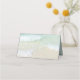 Two sand dollars standing table number cards. Use as place cards or escort cards by hand-writing guest's name on the front of folded cards. "Table number" text is provided in dark grey script, or it can be deleted. The background is a seashore image with blue-green water coming onto a sandy shore. Two natural sand dollars decorate the upper corner and the back of the cards have the same beach image. A turquoise water graphic covers the underneath / inside. Buy in sets of 25, with bulk discounts offered.