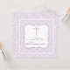 Christian Cross with intertwined wedding rings on white inset against elegant purple damask swirl background, Sophisticated square bridal invitation with Bible verse excerpt from the Gospel of Mark, 10:7,8: "For this reason a man shall leave his father and mother, and be joined to his wife, and the two will become one flesh. So they are no longer two, but one." Celebrate your marriage while sharing your love for Christ with this personalised customisable invite from The Christian Faith Gift Shop.
