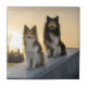 Photograph of two Shetland Sheepdogs sitting on a roof as the sun rises behind them.