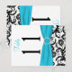 This black and white damask Table Number card has an aqua blue PRINTED ribbon and PRINTED diamond jewel brooch that would be perfect for an aqua and black themed wedding. **You MUST change the number 11's to each of the table numbers you need, add it to your cart, and then return and repeat the process until you have all the individually numbered cards that you need in your cart. ALSO, if you change fonts, or the size of the font, some of the design and/or text may get cut-off. Everything will print as you see it on your monitor. I will not see changes you make, and Zazzle will NOT correct anything (typos, mis-alignment etc.). The text is all customisable. You can select one of 2 sizes for the table number card. If you need help with this product, please email me BEFORE you place your order. If you require any other matching items, please email your request to niteowlstudio@gmail.com