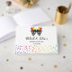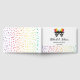 Two skull grooms and confetti in rainbow colours Halloween gay wedding guest book. This wedding design features the skulls of two grooms with hats in rainbow colours and colourful confetti. The back includes a pattern of colourful confetti.