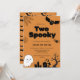 Halloween birthday party invitation card with pictures of a ghost, spider, bat, and candles. The title is two spooky."