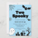 Halloween birthday party invitation card with pictures of a ghost, spider, bat, and candles. The title is two spooky."