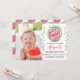 This cute watermelon-themed invitation is perfect for a second birthday party for a little girl who is turning two this summer. Easily replace the sample photo on the left half of the card with your child's photo. On the right half, the words "Two Sweet!" appear in white on a round watercolor pink and green watermelon. Add the birthday girl's name in pink script and party details in off-black sans serif font. Pink and green confetti decorates the left and right edges. The reverse side features a repeating pattern of the same watercolor melon motif on a white background.