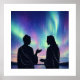 A minimalist poster illustration featuring a symbolic meeting between Buddha and Jesus beneath a radiant aurora, creating a calm and contemplative atmosphere for modern interior spaces.