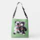 This cute adjustable strap length tote bag is printed with two adorable snuggly teddy bears. One Side with a purple background the other side with a green background, so it it extra versatile when styling with your outfits.