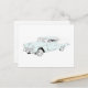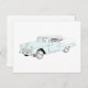 Drop a short hand written note on this 1955 Chevy Bel Air postcard featuring a blue and white two tone pencil style drawing of this classic car from the front and drivers side.