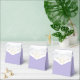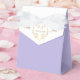 Shown is a tent style favour box in Lavender and White with a fancy Golden-colour printed heart pattern on it. Embellished with a White ribbon at top. Top is White, rest of box is shown in Lavender. Newlyweds names on each side of heart and the last name inside the heart. Heart design on flap. Customise this item or buy as shown.