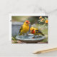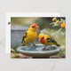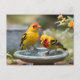 This is an AI generated image. I wanted to have a western Tanager sanding in water in a bird bath. It looks like there is water in the bird bath but I am not sure it looks all that realistic. I am not sure what the orange flowers are.