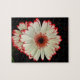 Two gorgeous white gerbera daisies, one behind the other. White petals with red at the ends and black background.