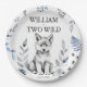 Two Wild wolf themed birthday party tableware personalised party plates, cute fluffy grey wolf cub some forest leaves for a wolf woodlands birthday party