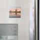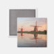 Souvenir photo magnet with two windmills along a river with reflection in the still water in the sunset light on a summer evening in the Netherlands.