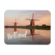 Rectangular photo magnet with two windmills along a river with reflection in the still water in the sunset light on a summer evening in the Netherlands with the text 'Holland'.