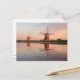 Photo postcard of two windmills along a river with reflection in the still water in the sunset light on a summer evening in the Netherlands.