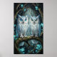 Two wise, ancient white blue owls with crystalline shard feathers perch on a gnarled, moss-covered branch in a hidden grotto. Bioluminescent fungi cast an ethereal glow on their intricate, jewel-like eyes. The air is thick with mystery and quiet magic. Fantasy concept art influenced by the vibrant, mystical illustrations of Pablo Amaringo. Rendered in a hyperrealistic, oil painting style with thick, layered impasto brushstrokes reminiscent of post-impressionism and neo-impressionism. Close-up portrait, professional studio lighting, sharp focus.