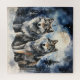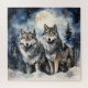 Two wolves in winter with snow, stars and moon