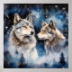 Two wolves in winter with snow, stars and moon